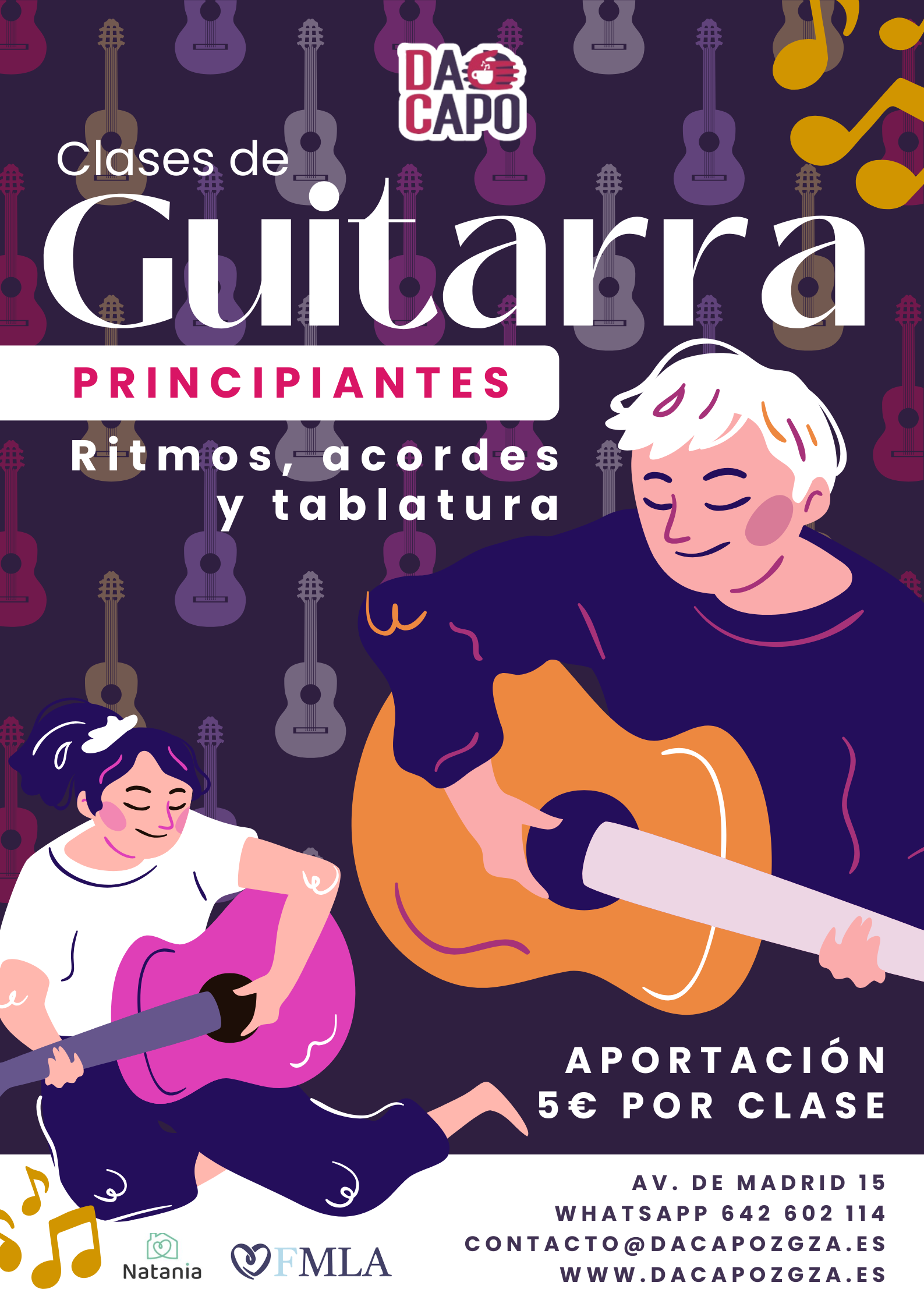 Cada sesión es de una hora en grupo reducido de 3 o 4 personas. Aprendemos los acordes, diferentes ritmos, tablatura.